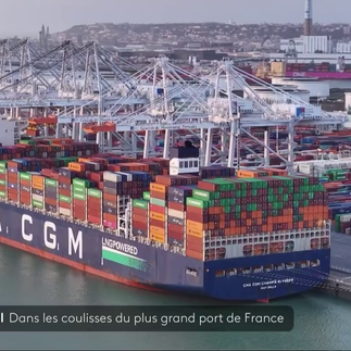 Intervention pour France Télévisions dans la prise de vues aériennes sur le Terminal de France avec la compagnie Maritime CMA-CGM dans le cadre d'un reportage du journal de 20h00 de France 2 sur le port du Havre en ébullition, derniers arrivage avant les fêtes.